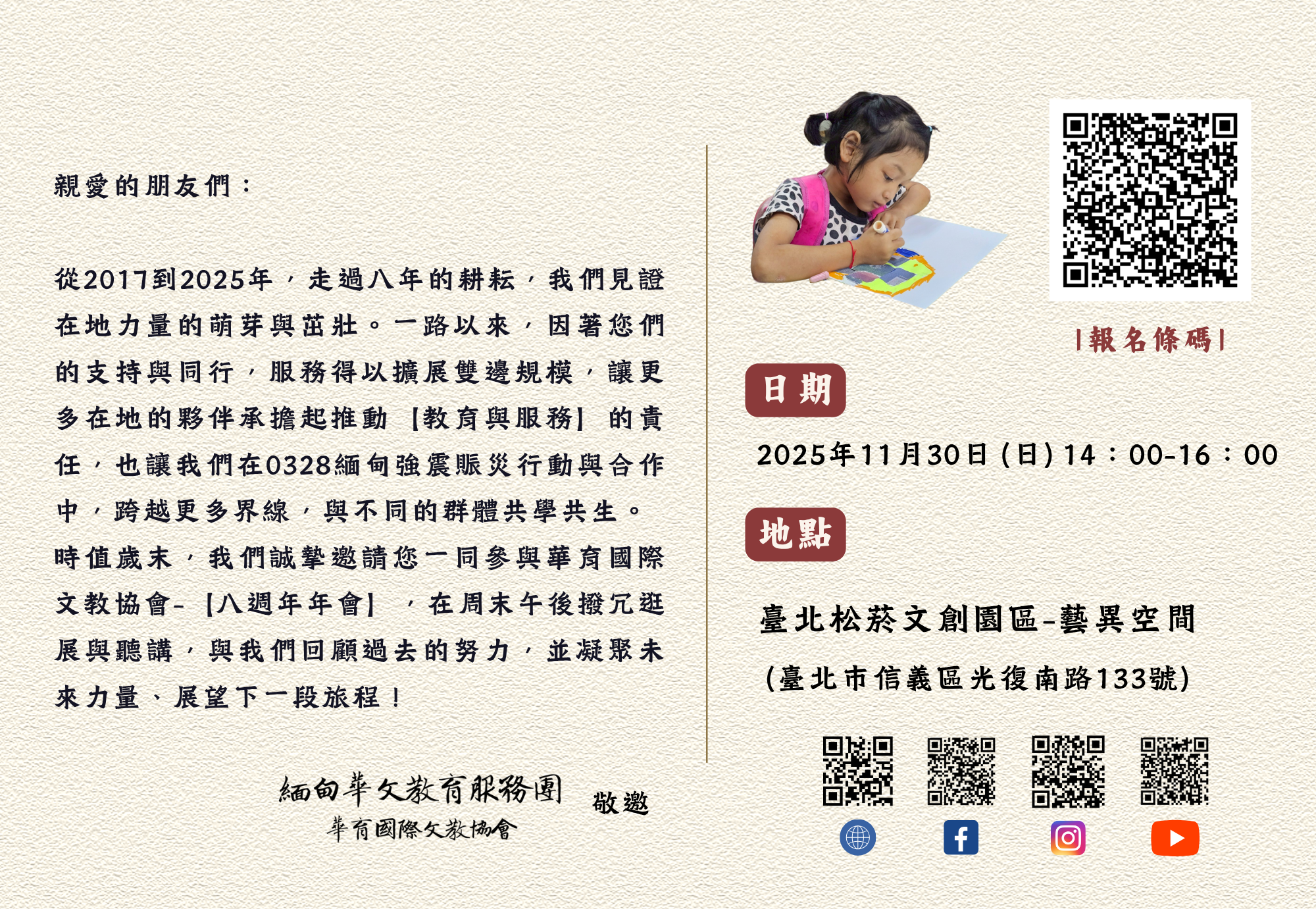 八周年年會將由團長林語珊回顧歷年服務成果,重點分享【緬甸基金會成立與 0328強震賑災經驗】,並介紹在地教育計畫與2026年寒假志工招募活動!同場次,我們更邀請緬甸夥伴來台分享【震後兒童照顧與弱勢戶重建】,共同帶大家認識華育協會的下一步海外拓點!